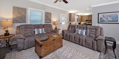 After a long day at the beach...it's time to relax in the perfectly appointed living room with 55" Direct TV and Roku, two sofas with four recliners built in, and coffee table packed full of games.