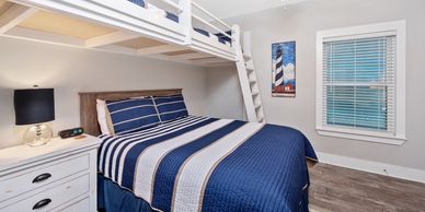 It's the ultimate slumber party in this adorable bunk room. One queen bed and two junior bunks. Plenty of space for (4) kiddos. They'll be well entertained with their own flatscreen tv & dvd player. We also provide a pack-n-play crib and a highchair.